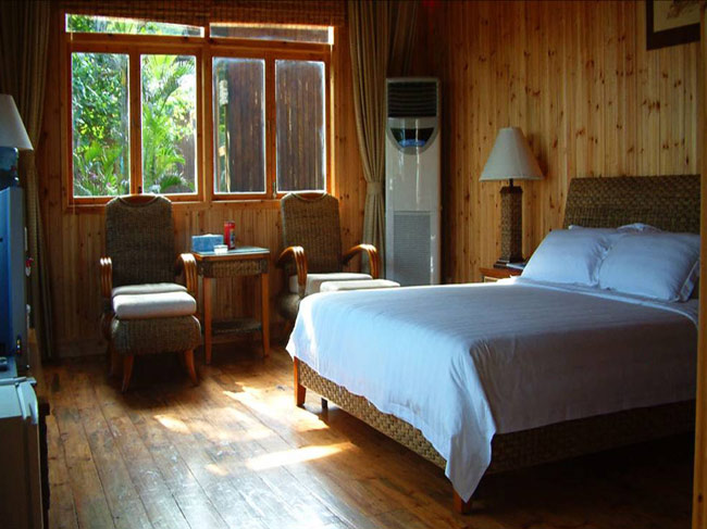 三亞蜈支洲島度假中心屬熱帶海洋性氣候,全年溫和氣爽,四季怡人。由于小島地處三亞海棠灣,避開了臺風走廊,所以不同于一般只能生長灌木的北部小島,這里喬木高大挺拔,灌木繁茂葳蕤,如天然織就的一塊厚重的綠毯披在島上,麗質(zhì)天成。小島地貌美麗而有層次:島的中部坡地逶迤,起伏平緩,草木紛亂,藤蔓纏結(jié),花紫果綠,蟬噪鳥鳴。西部及北部平緩延伸入海,形成一彎路玉帶狀的銀色沙灘,沙質(zhì)均勻細膩,色澤潔白如雪,海水由淺入深,顏色由透明而碧綠繼而淺藍,后而深藍,明麗動人層次分明。東部與南部則是現(xiàn)兩峰相連,最高峰海拔79.9米,其氣勢與洶涌仄相向,懸崖壁立如削,人跡難至,其下礁石林立,奇形萬狀,驚濤拍岸,泡沫如雪。大風或大潮時,海浪咆哮奔騰激起的浪花可高達十米,形成獨特的山海奇觀。小島現(xiàn)已被開發(fā)了三分之一,都位于西北部。建設者獨具匠心,巧妙地利用了地形地貌,使人工設施掩映期間,不減其風采,反增其情趣。這里椰影婆娑,綠草成蔭,竹制建筑娉婷綽約,泳池碧波蕩漾。草地上小徑蜿蜒,點綴些秋千、蹺蹺板、石凳、竹制躺椅,編就了一幅世外天堂的畫面。